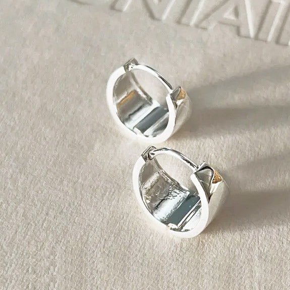A pair of 925 sterling silver wide hoop earrings on a neutral background.