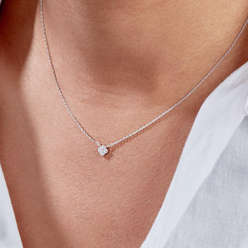 The sterling silver necklace with a clear zircon petal pendant, elegantly worn.