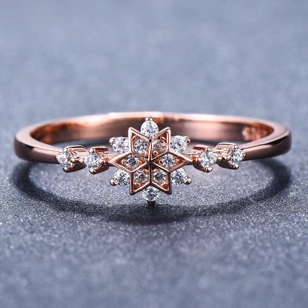 - The Starlight Sparkle snowflake ring in a warm rose gold finish, adorned with sparkling diamonds.