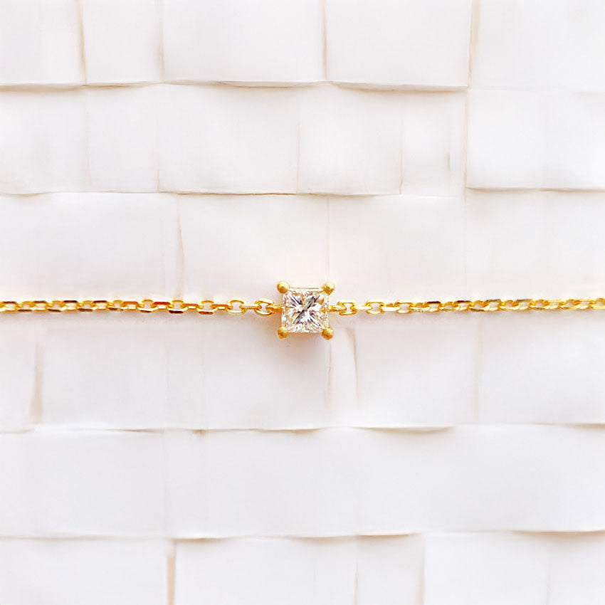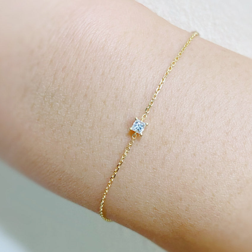 - Close-up of a single 925 sterling silver bracelet with a square cubic zirconia stone.