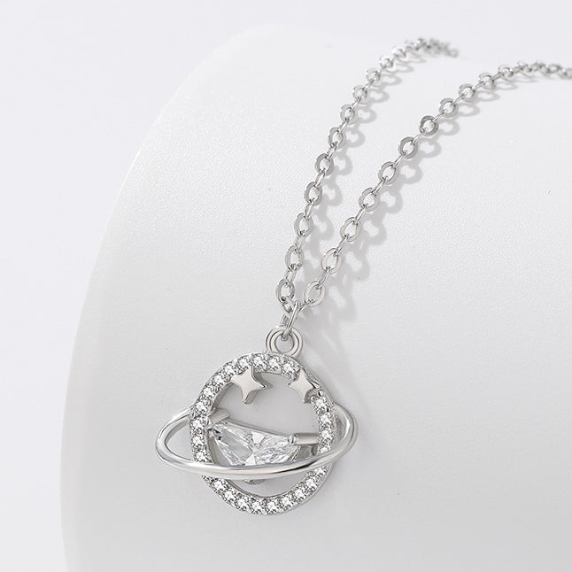 A planetary-themed 925 silver pendant necklace adorned with a large clear gemstone and decorative elements.