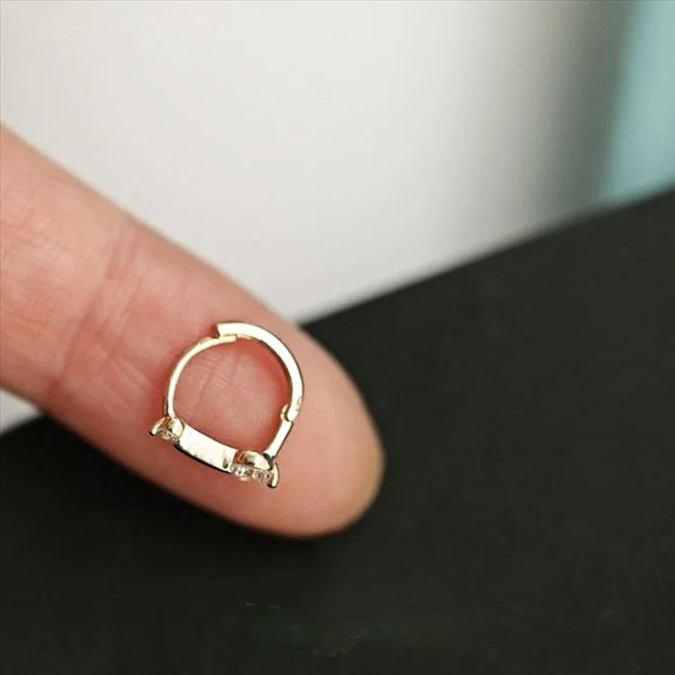The delicate size of a tiny zircon huggie earring is shown on a fingertip for scale.