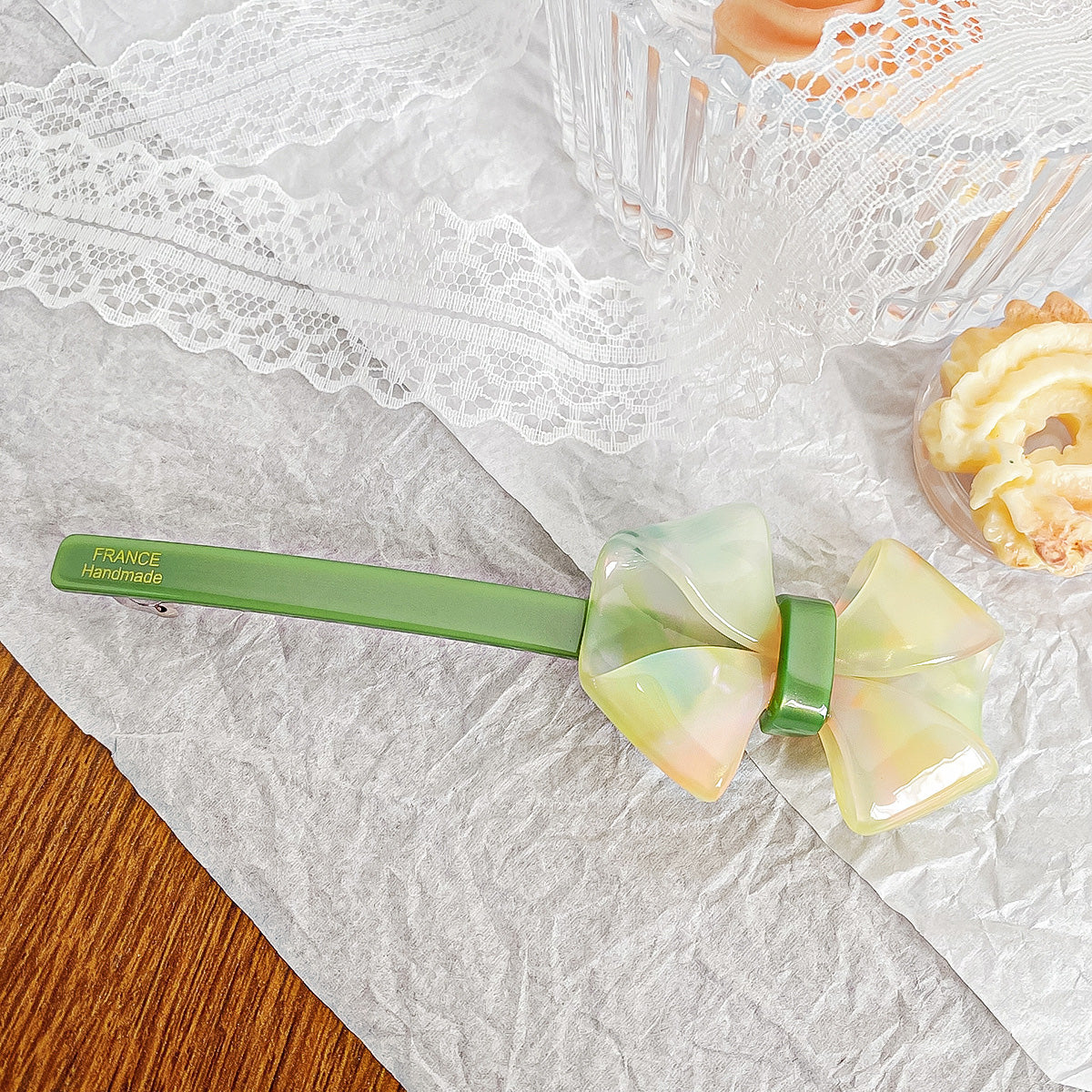 A vibrant green handmade acetate bow hair clip with 'FRANCE Handmade' inscription.