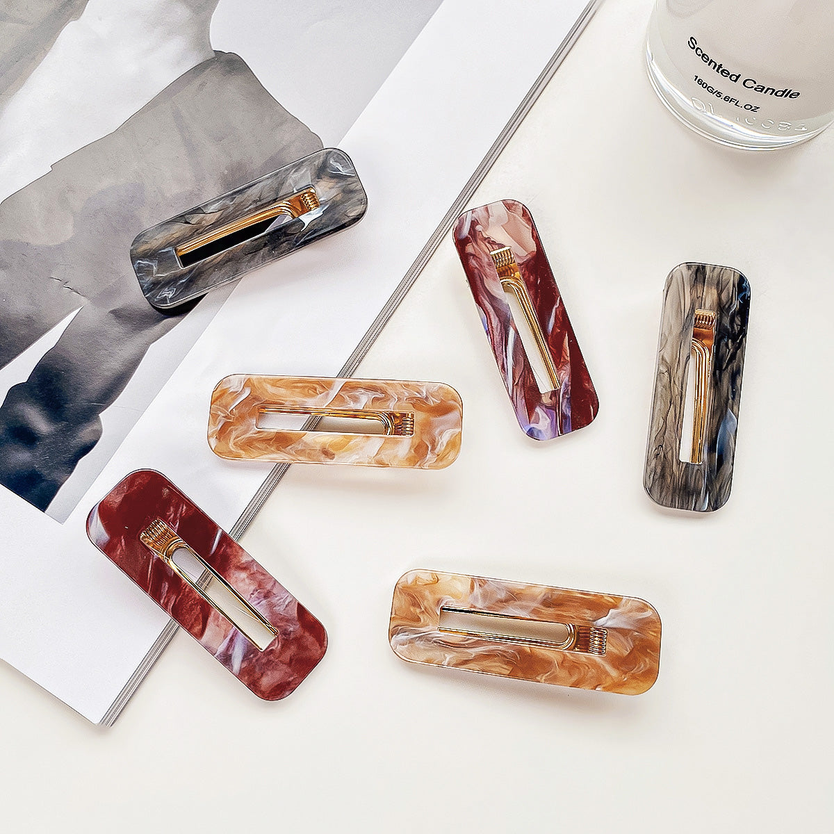 Lifestyle shot of colorful marbled hair clips arranged next to a lit scented candle.