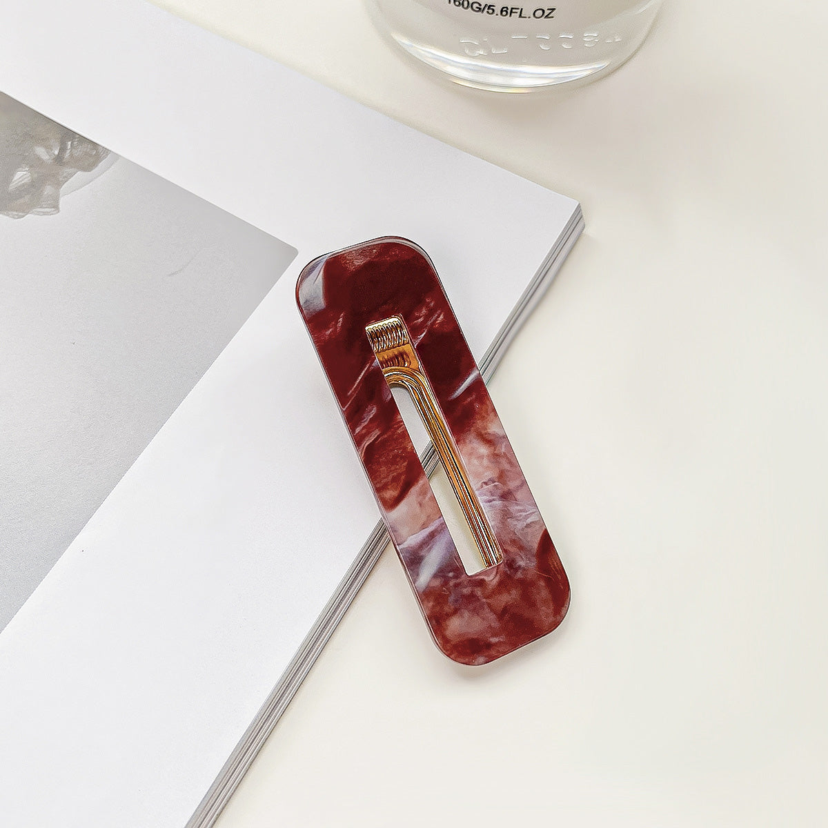 Detailed product photo of a brown marbled acrylic hair clip.