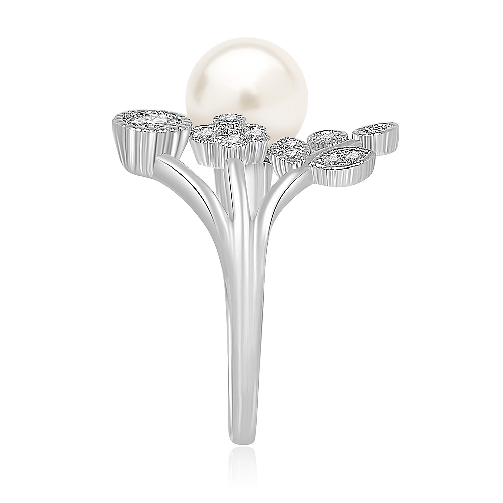 - Side view of the Pearl Allure Ring showcasing the detailed floral pattern with multiple clear cubic zirconia gemstones.