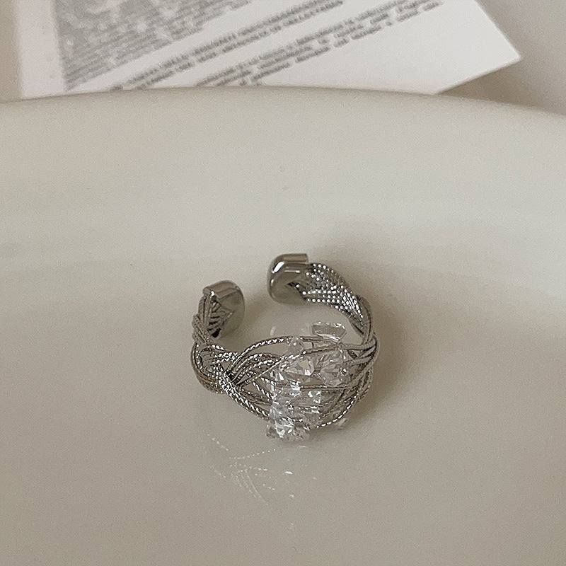 - Unique abstract silver-tone ring with crystal details for a modern, luxurious look.