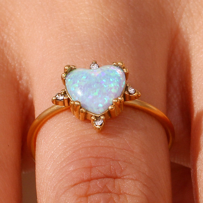 Detailed view of the heart-shaped adjustable stainless steel opal ring.