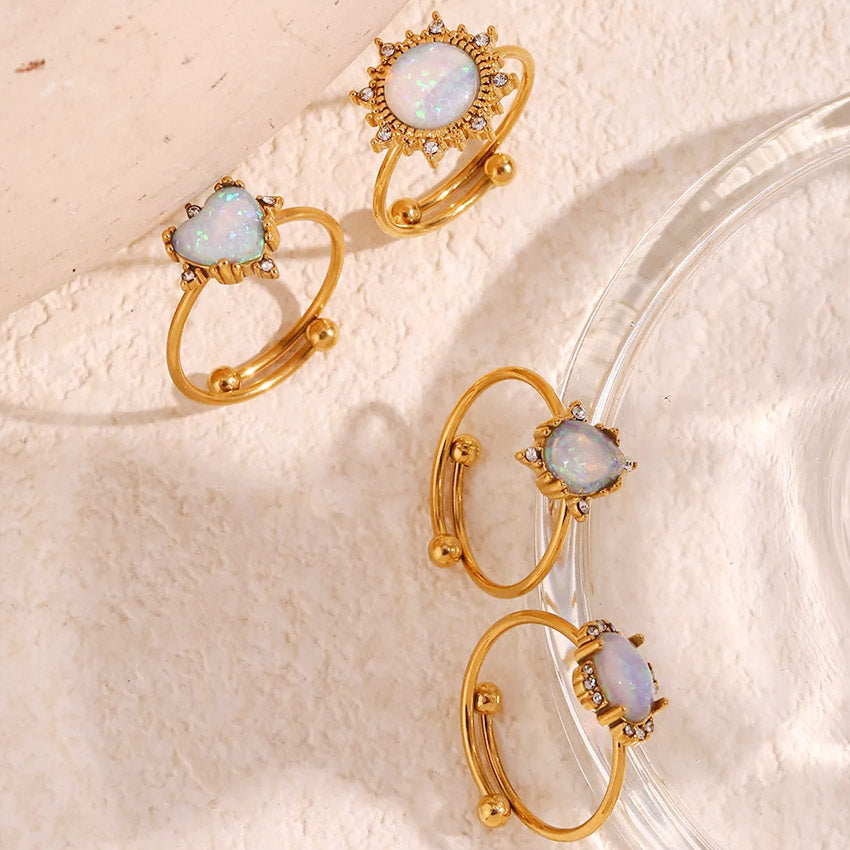 Discover timeless elegance with our set of five adjustable opal rings. Crafted from durable stainless steel with luxurious 18K gold plating, each ring showcases a stunning opal gemstone accented by sparkling zircons. The set includes four unique designs—heart, oval, round, and teardrop—offering versatile style for any occasion. The adjustable open-ring design ensures a perfect, comfortable fit.