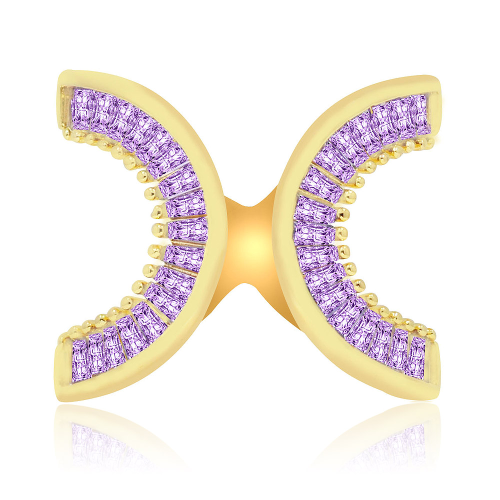 - Side view of the Amethyst Purple Contemporary Ring, showing the intricate gold band and the setting of the purple gemstones.