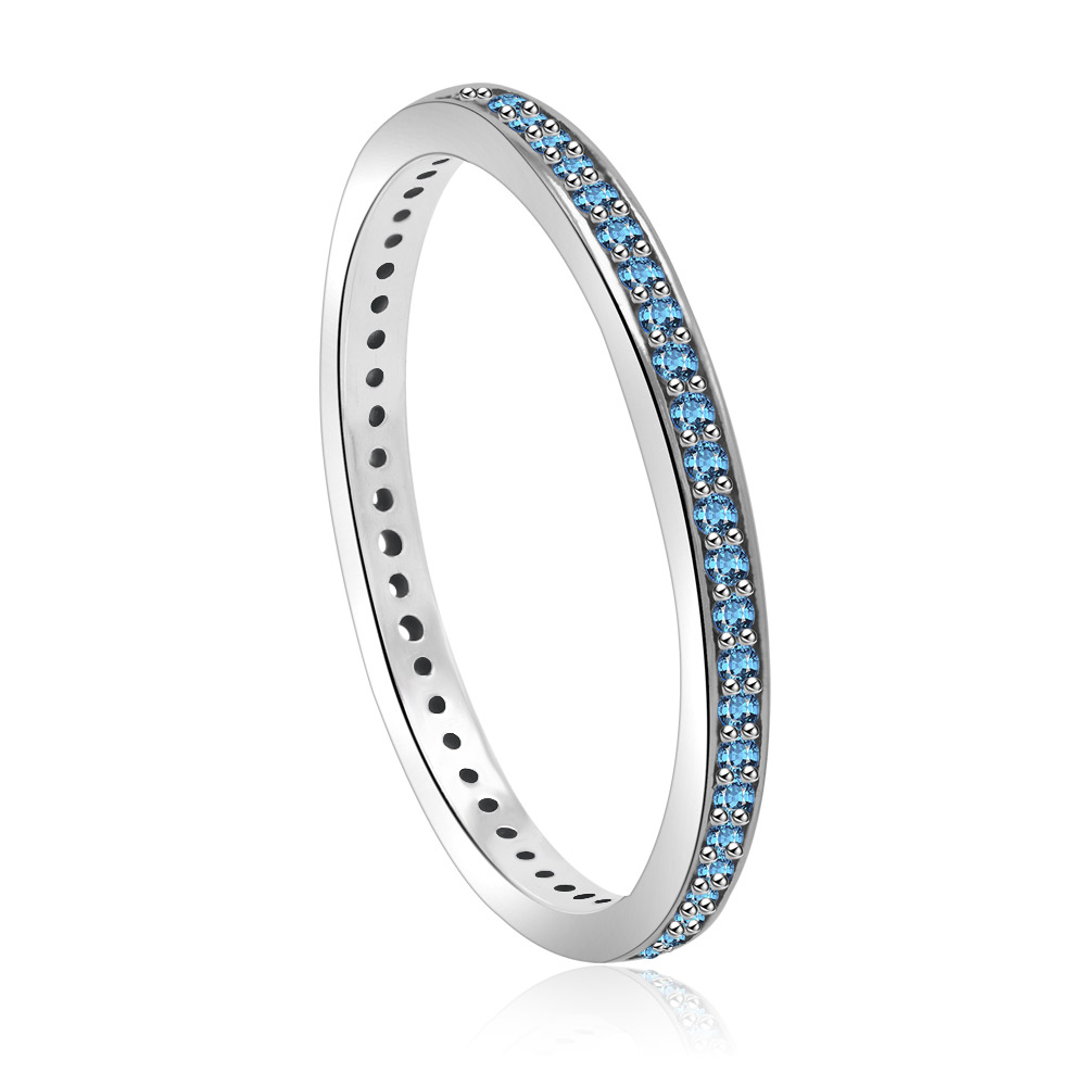 - Side view of the Aquamarine Cubic Zirconia Silver Eternity Ring, highlighting the perforated interior of the silver band.