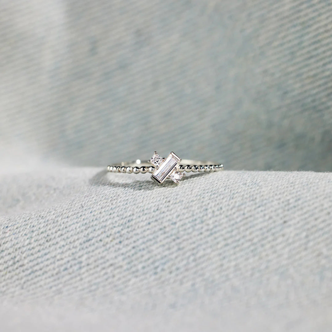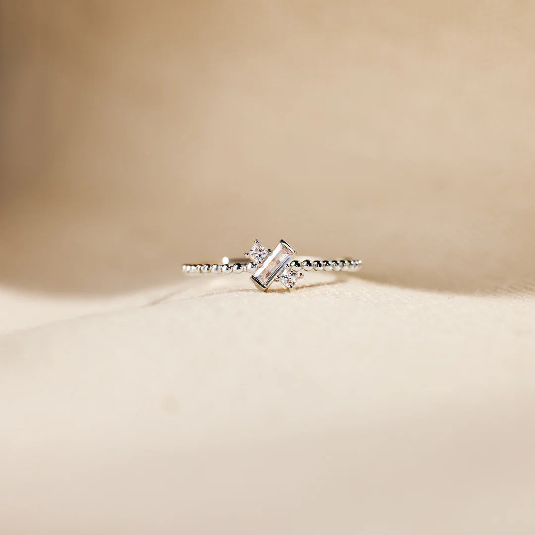 This ring evokes the beauty of a starry night. The central rectangular Zircon symbolizes a bright shooting star, while the diamond-shaped accents serve as its celestial companions. The delicate bead band resembles the Milky Way, giving the entire design a sense of movement and harmony. Whether worn daily or for special occasions, this ring adds a touch of understated luxury to any outfit. It can be the star of your jewelry collection or layered with other rings to create a personalized, stylish look.