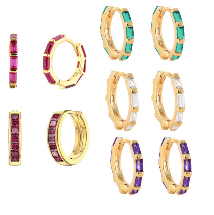 - A collection of Baguette Mini Huggies Hoop Earrings available in various gemstone colors.