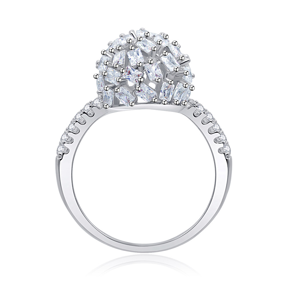 - Angled top-down view of the CZ cluster ring, emphasizing the intricate arrangement of baguette and round stones.