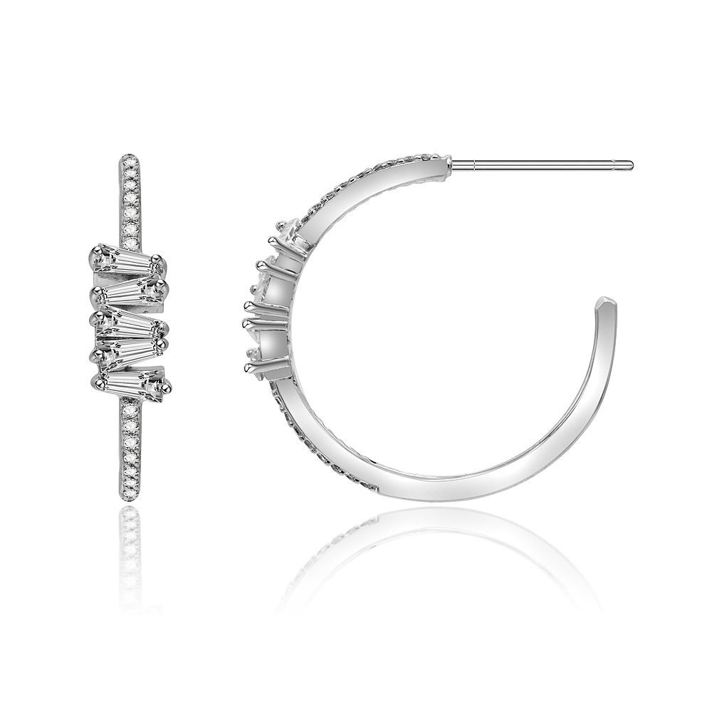 Discover the elegance of our Baguette Semi Hoop Earrings, exquisitely crafted with a radiant rhodium plating and adorned with brilliant, baguette-shaped cubic zirconia gemstones. These earrings are designed to be both tiny and versatile, making them perfect for pairing with other pieces for a curated ear look. Their sophisticated design offers an elegant touch suitable for everyday wear or for adding sparkle to a special night out.