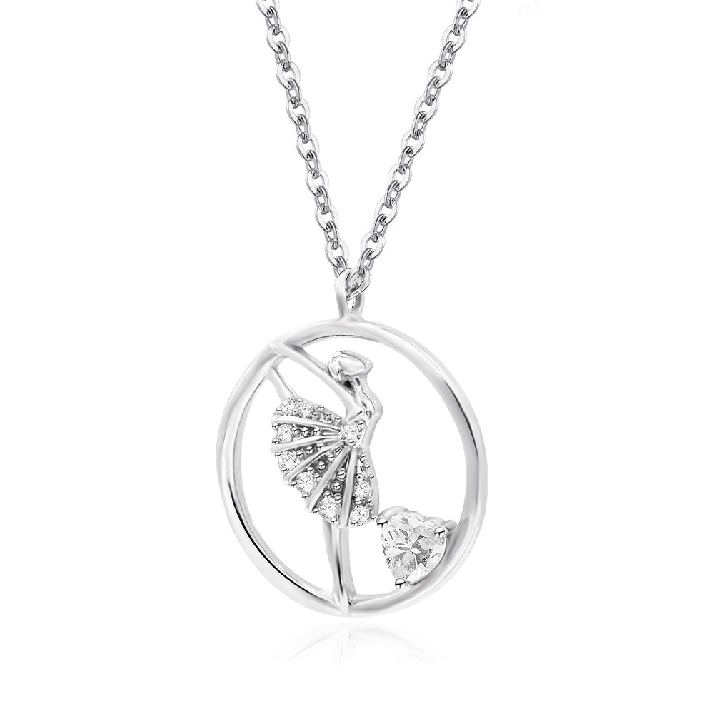 This graceful and elegant ballet dancer is posed mid-arabesque. Her grace and beauty are apparent as she moves across the room. This form of dance originated in the 15th century in Europe and is now practiced worldwide by talented performers. This rhodium-plated brass necklace features a cubic zirconia pendant, making it a perfect gift for dancers or anyone who appreciates fine, themed jewelry.