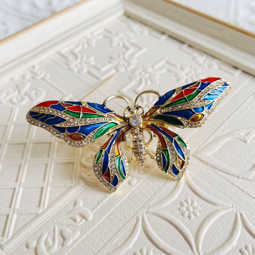 - Detailed view of the butterfly brooch with colorful stained glass-like wings.