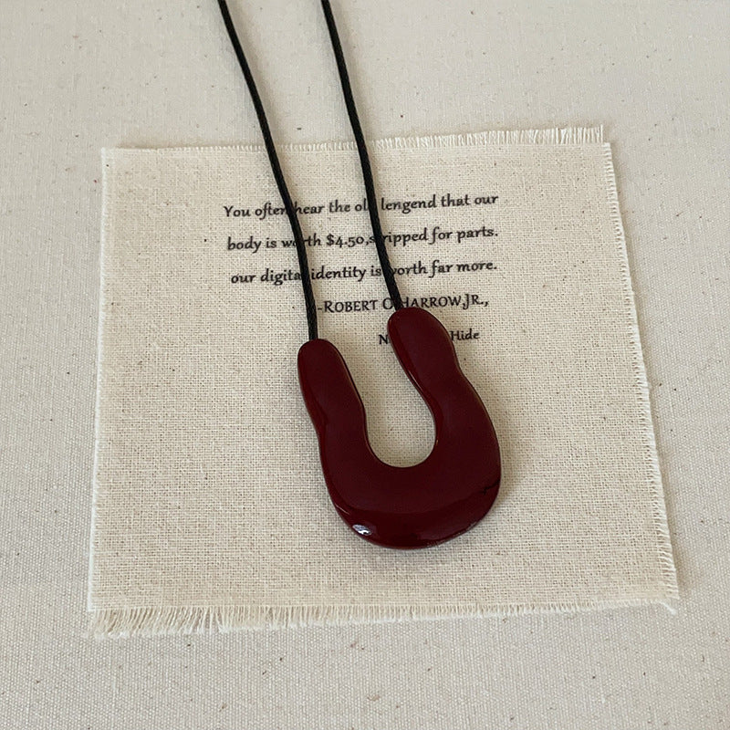 The striking dark red U-shaped pendant necklace, a bold statement piece.