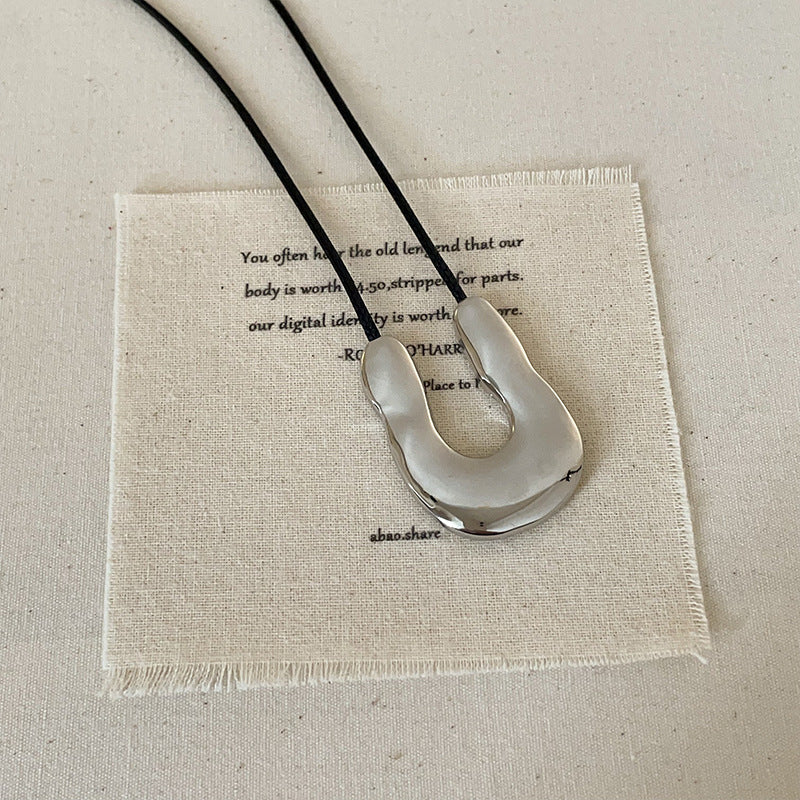 Close-up of the silver U-shape pendant on a black cord, highlighting its sleek minimalist design.