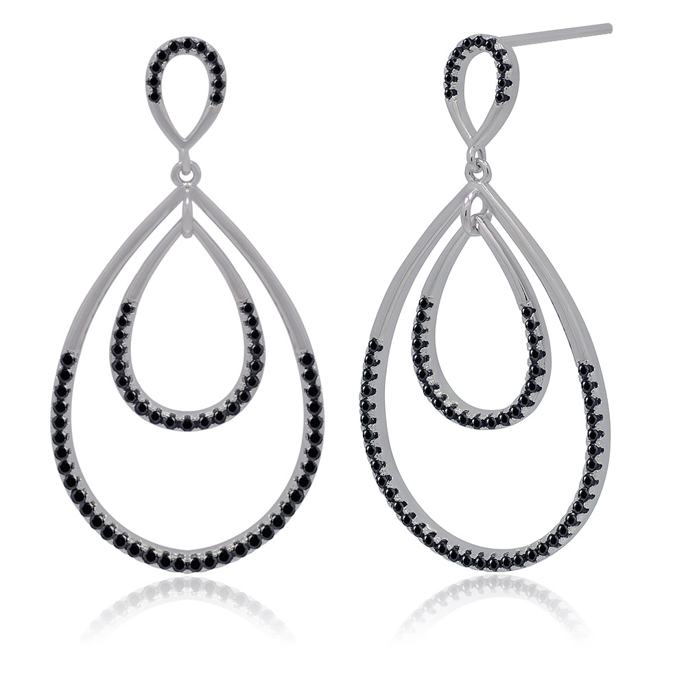 Detailed close-up of the silver teardrop earrings, highlighting the sparkling black gemstones set in the double-layered frame.