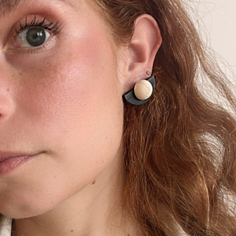 Lifestyle image showing a model wearing the unique black and wood fan-shaped earring.
