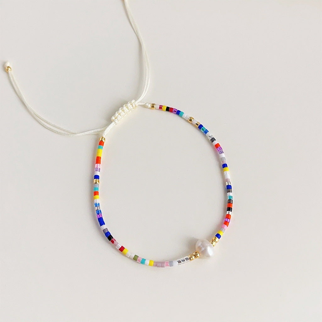 - Close-up of a multi-colored bohemian beaded bracelet with a central pearl.
