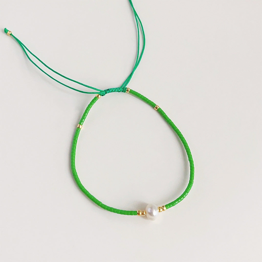 - A delicate green cord bracelet featuring a single pearl and gold bead details.