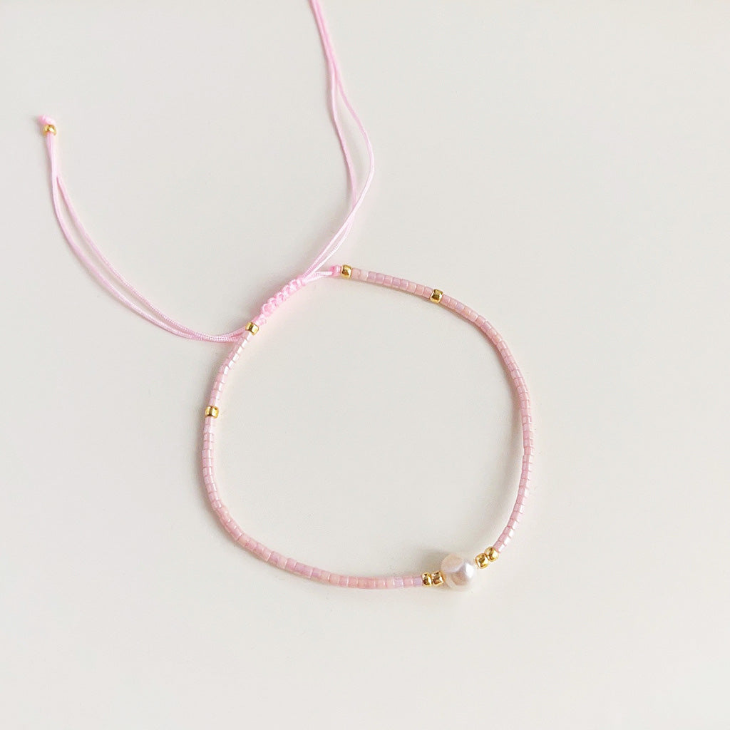 - A charming pink beaded bracelet with gold details and a central pearl, perfect for stacking.