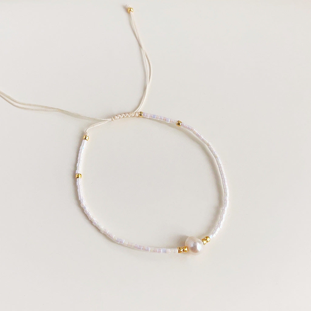- An elegant white beaded bracelet with an adjustable clasp, gold accents, and a pearl.