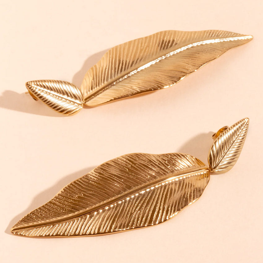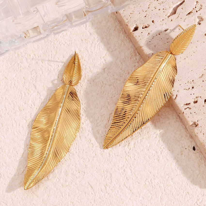 The Women's Gold Drop Stainless Steel Leaf Earrings are designed to add a bohemian and nature-inspired touch to your spring and summer outfits. Made from high-quality stainless steel with 18K gold plating, these earrings feature a delicate feathered leaf shape and an elegant drop stud design, perfect for a chic yet effortless look.
