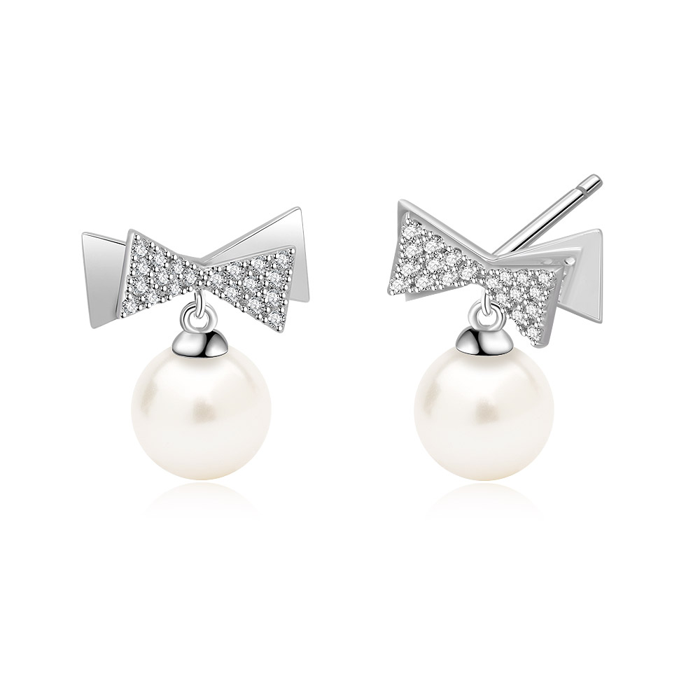 - Detailed shot of the Bow 7mm Pearl Drop Earrings, highlighting the brilliant cubic zirconia and the smooth surface of the pearl.
