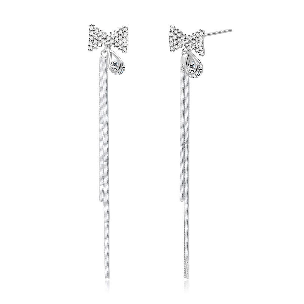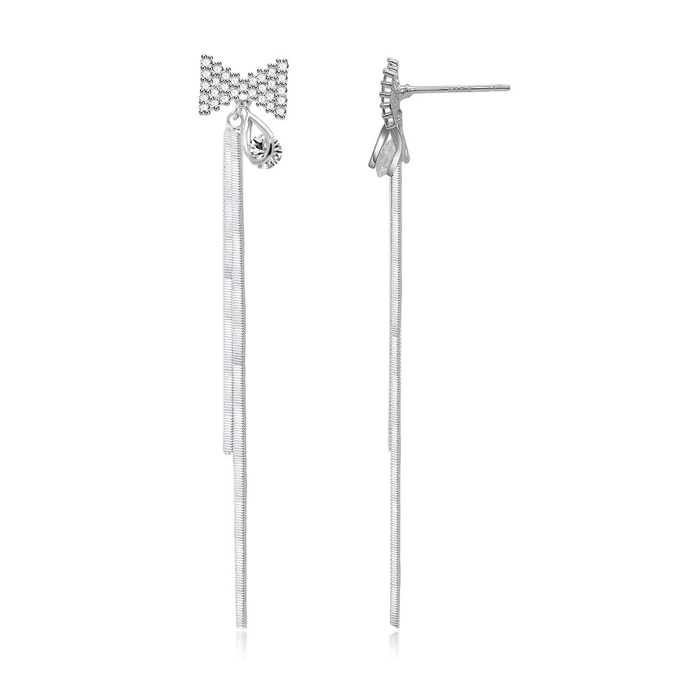 Detailed view of the bow-shaped top with cubic zirconia stones and a teardrop accent on the Bow Long Snake Chain Drop Earrings.