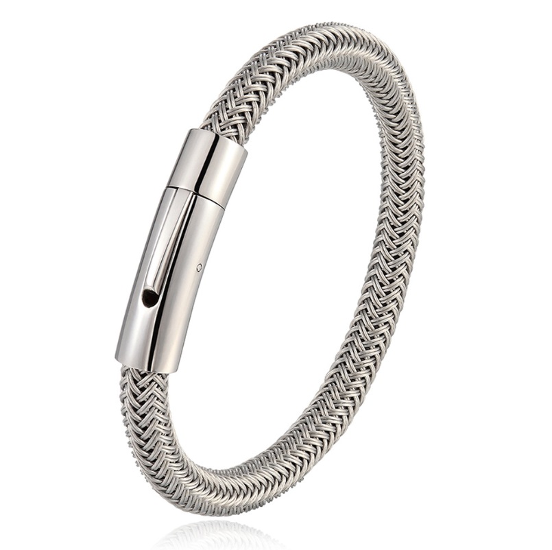 - Braided men's bracelet in a silver stainless steel finish, showing the woven texture and clasp.