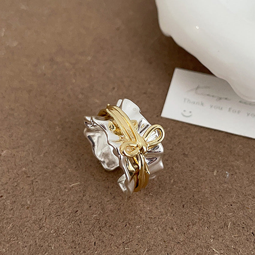 - A stylish two-tone adjustable bow ring in gold and silver, displayed on a neutral background.