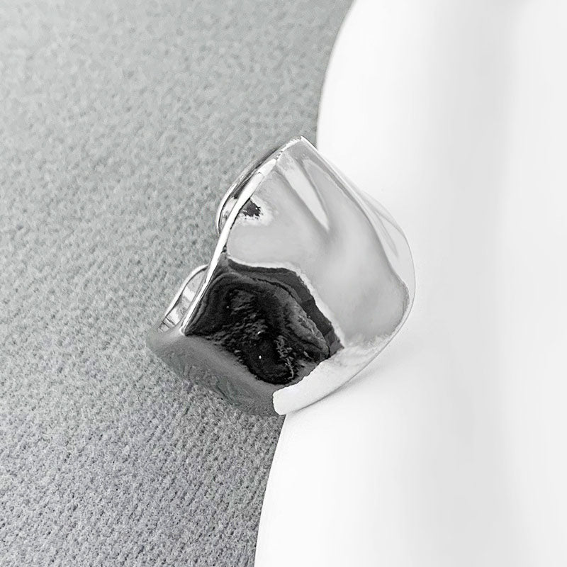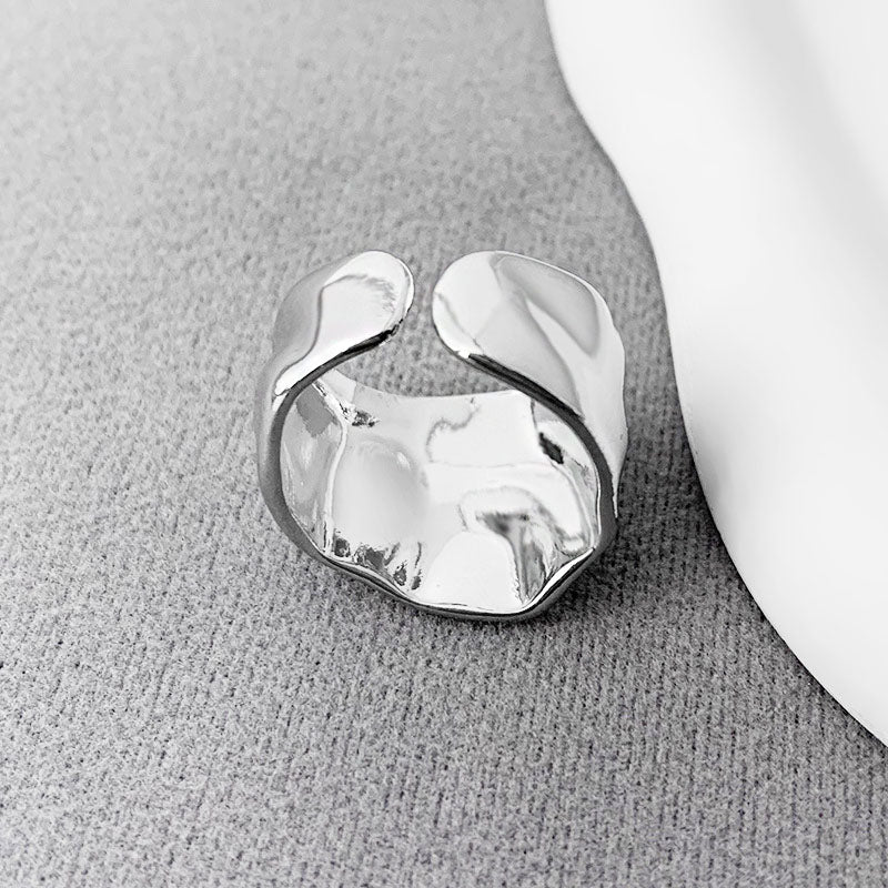 - Side profile of a silver wide band open ring, highlighting its hammered finish.