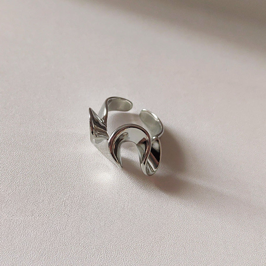 Close-up of an abstract silver adjustable ring with a crescent design from the wholesale set.