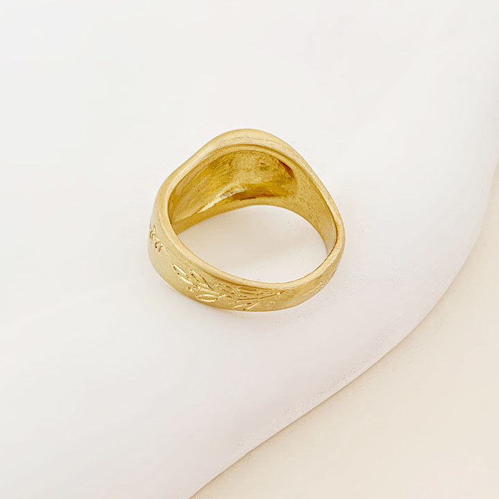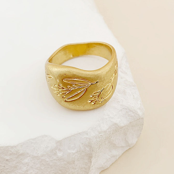 Close-up of a gold chunky ring with floral engraving worn on a finger.