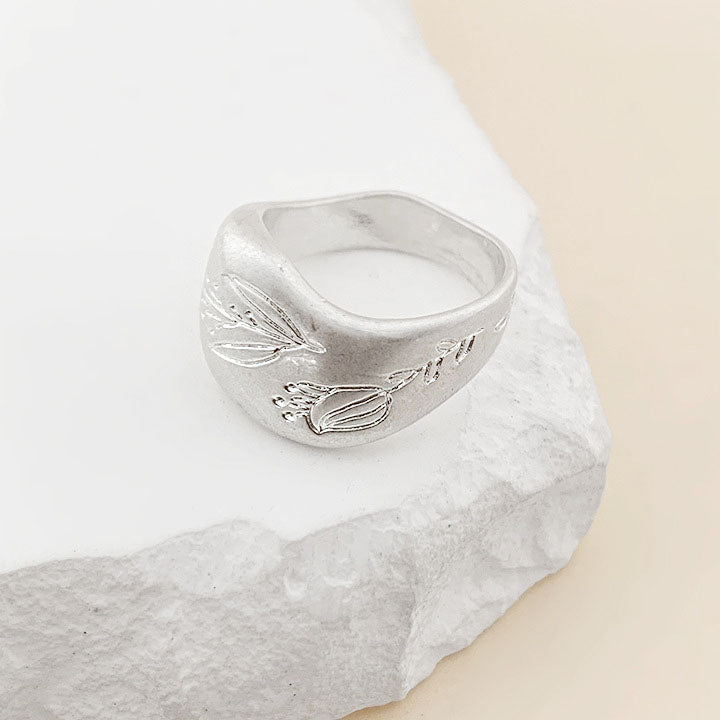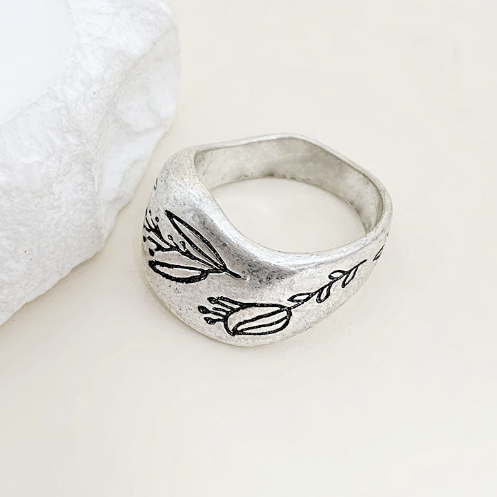 Product image of the silver brass ring highlighting its floral engravings.