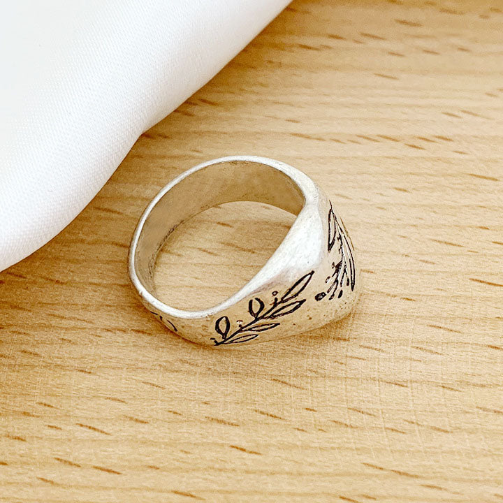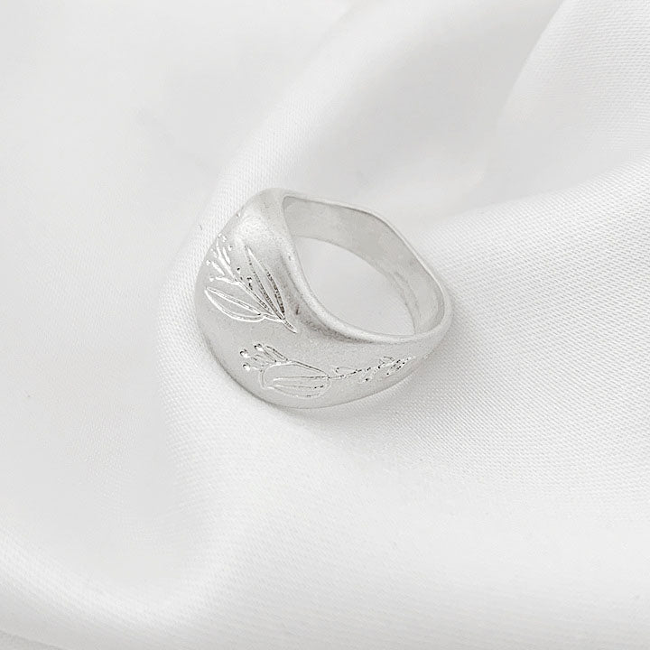 Detailed product shot of the silver brass ring with an elegant leaf engraving.