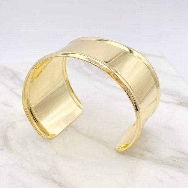 - Angled view of the shiny gold cuff bracelet, highlighting its modern design.