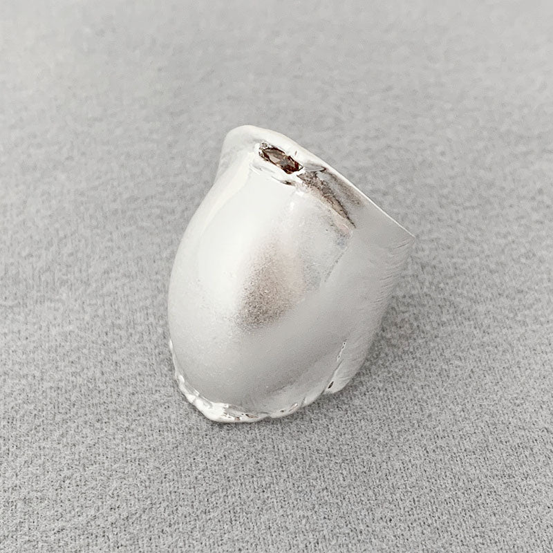 Detailed view of the polished silver finish on a drum-shaped brass ring.