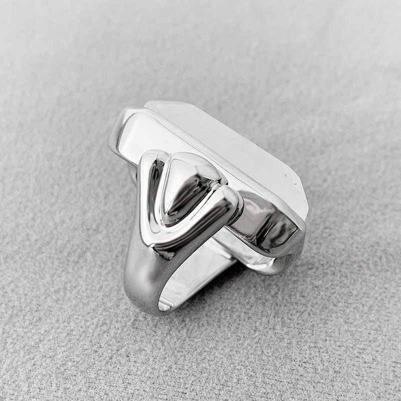 Close-up of a silver-finished ring featuring a prominent rectangular crystal.
