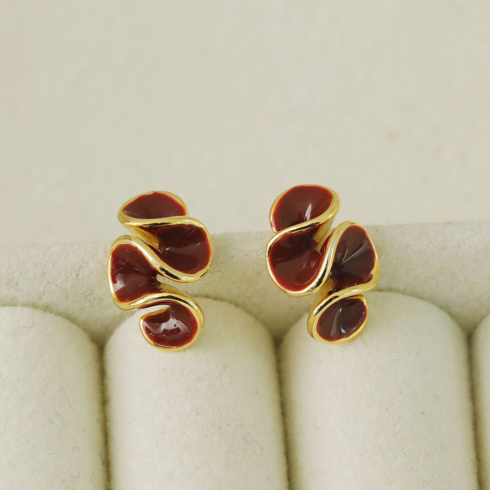 The dark red enamel geometric earrings showcasing the intricate wave design.