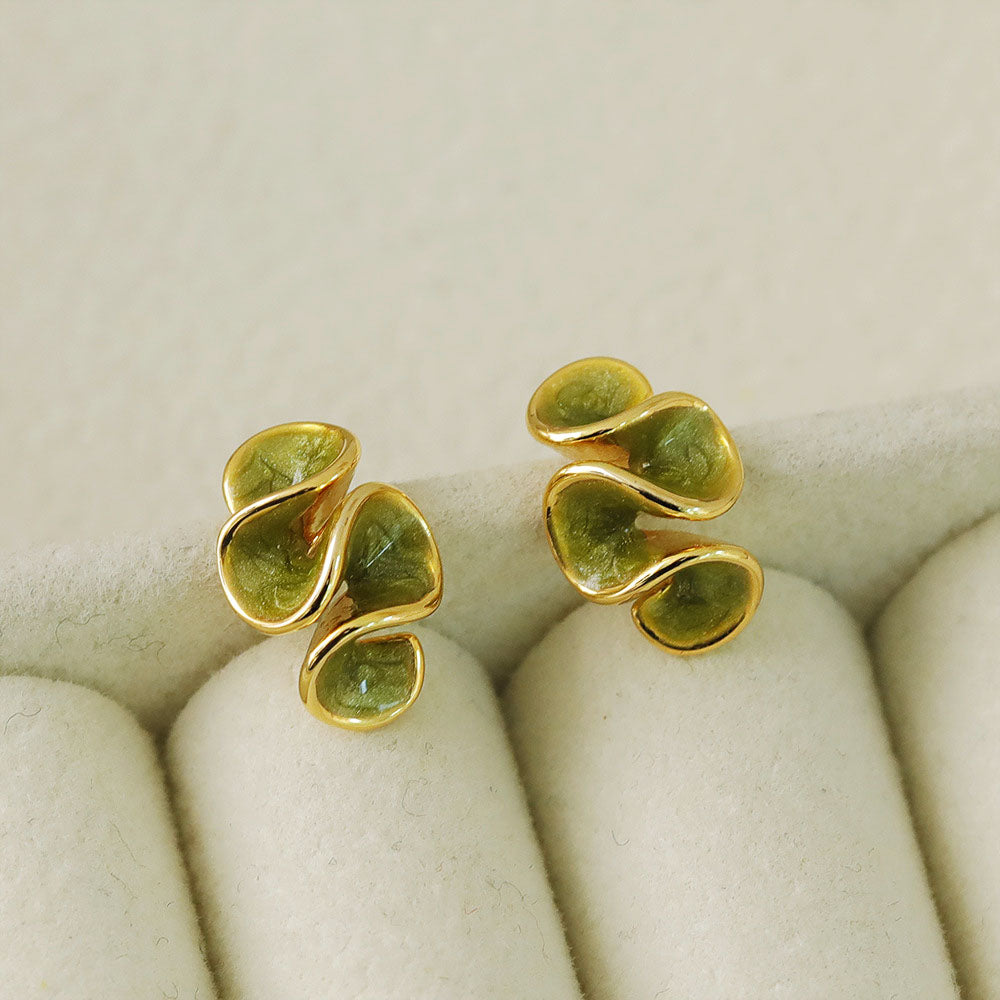 Vibrant green enamel earrings with an intertwined gold wave pattern.