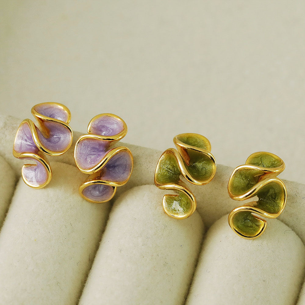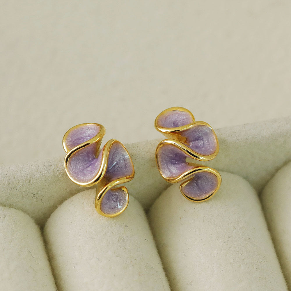 A pair of purple enamel wave earrings with a unique swirling gold design.