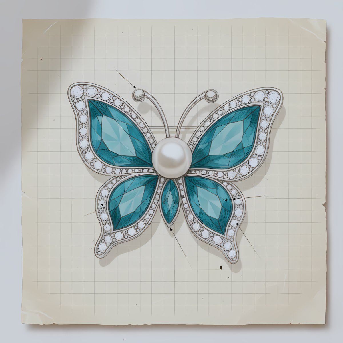 - Design concept sketch for a custom butterfly brooch with teal gemstones and a pearl center.
