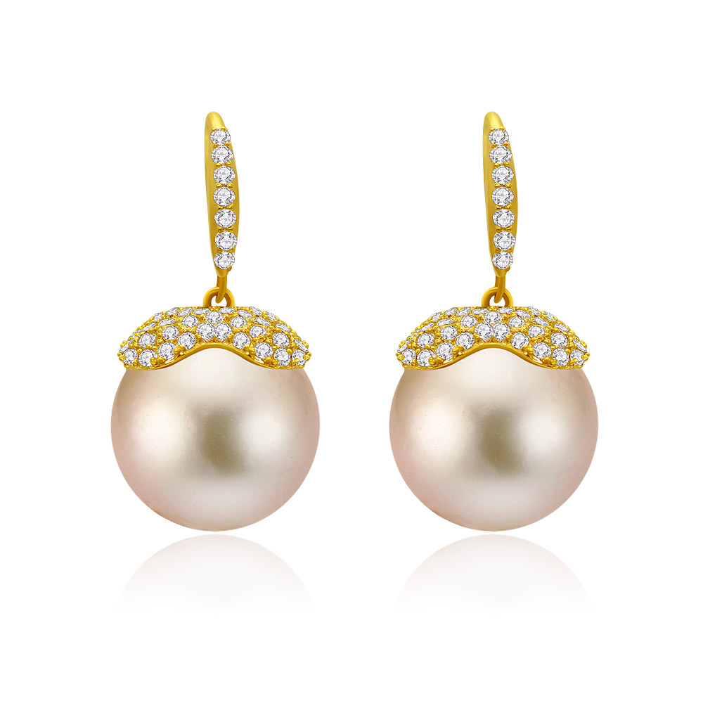 - Elegant drop earrings featuring large pink pearls with diamond-encrusted gold settings and hooks.