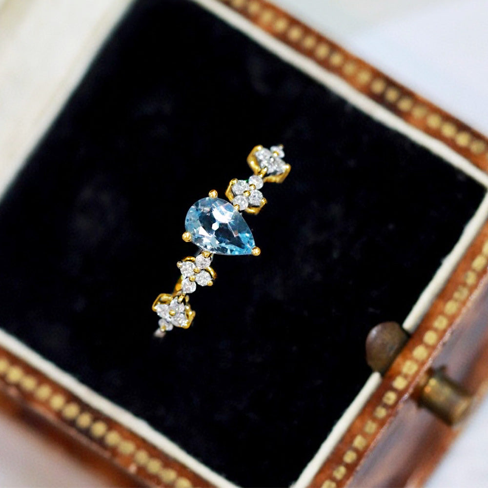 - A model wearing the aquamarine pear-shaped ring to showcase its elegant fit and style.