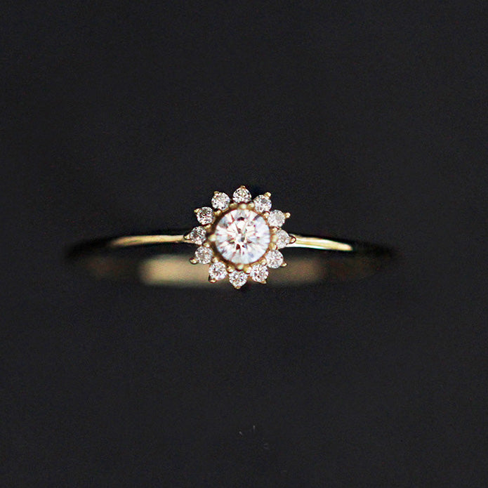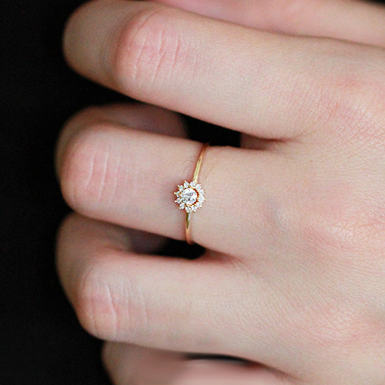 - Detailed view of the sunflower ring's halo setting with a central CZ stone.