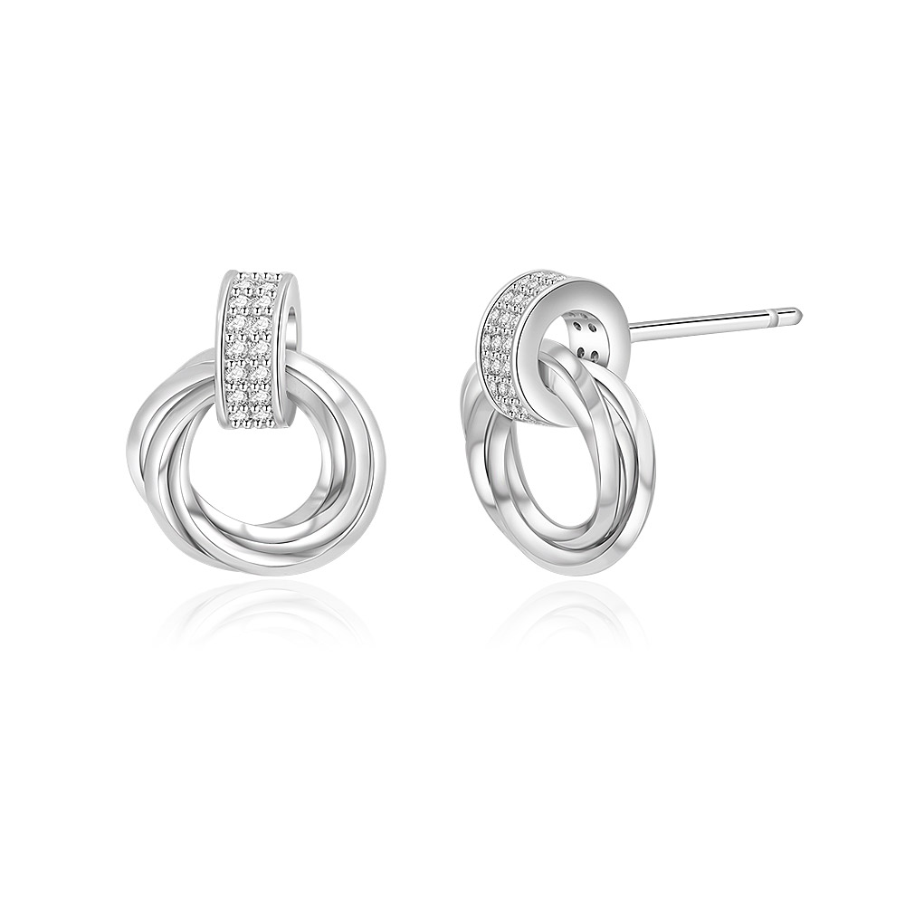 The Chic Circle Interlock Studs are a testament to meticulous design and quality manufacturing. Each pair is crafted from a base of high-quality brass, known for its durability and workability, and then plated with rhodium to provide a brilliant, tarnish-resistant finish that mimics the appearance of white gold. The white cubic zirconia stones are carefully set to maximize their brilliance and ensure they remain secure.